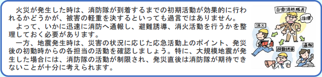 | 「防火管理」とは、火災の発生を予防し、万一火災が発生した場合には被害を最小限に止めるために必要な対策を立てることです。そこで重要になるのが「自分のところは自分で守る」という自主防火管理です。 | |