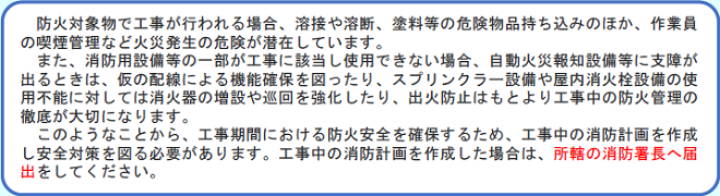 | 過去の災害を振り返ると、防火管理を怠っていたことにより死傷者を伴う火災が発生した場合は、刑事上・民事上の責任が問われることがあり、管理権原者に求められる防火管理責任は非常に重いものです。 悲惨な火災を起こさない、建物や建物を利用する全ての人の命を守るため、防火管理の趣旨を十分理解して、あなたの事業所でも防火管理体制を充実させることが必要です。 |