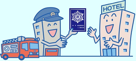 | 「適マーク制度」とは、宿泊施設の防火対象物適合表示制度のことです。平成24年5月に発生した広島県福山市のホテル火災を受けて、被害の拡大防止対策の一環として始まった制度です。 この制度は、宿泊施設の関係者からの表示マーク交付申請に基づき、消防が建物の審査をした結果、消防法令のほか、重要な建築構造等に関する基準に適合していると認められた建物に対し、「適マーク」を交付する制度です。 宿泊施設が「適マーク」を掲示することにより、建物の安全・安心に関する情報を利用者に提供することが可能となります。 |