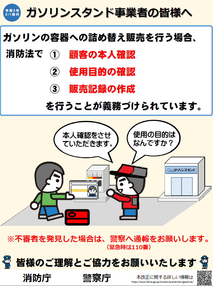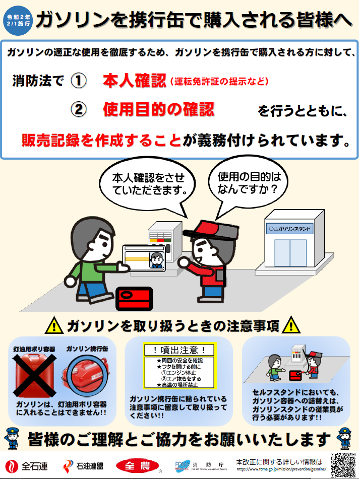 令和元年7月18日、京都府京都市伏見区において死者34名、負傷者34名の極めて重大な人的被害を伴う爆発火災が発生しました。同様の事案の発生を抑止するため、危険物の規制に関する規則の一部を改正する省令が交付され令和2年2月1日からガソリンを販売するため容器に詰め替えるときは、顧客の本人確認、使用目的の確認及び販売記録の作成を行うことになりました。