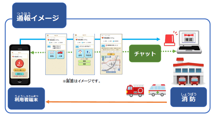 聴覚・音声・言語機能等の障害により、音声による119番通報が困難な方が、スマートフォン等の携帯端末を利用し、消防へ音声によらない通報を行えるシステムです。なるべく文字入力をすることなく、画面をタップしていく簡単な操作で「火事」や「救急」といった情報や通報場所を伝えることができます。