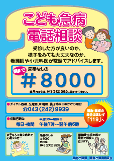 | A: | 千葉県が行っている電話相談をご利用ください。 小児の場合は#8000に電話をしてください。受付時間は19時~6時(毎日)です。 成人の場合は#7119に電話をしてください。受付時間は 平日・土曜は18時~翌朝8時、日曜・祝日・年末年始・ゴールデンウィークは9時~翌朝8時です。 下の画像をクリックすると、リーフレットがPDFで開きます。 |