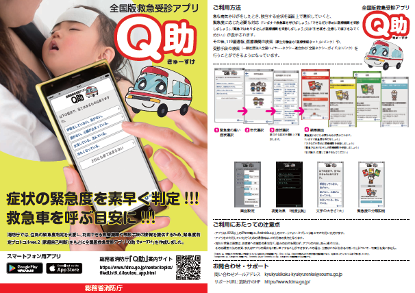 | A: | 総務省消防庁が提供している、救急受診アプリ「Q助」をご活用ください。アプリの使用にはスマートフォンやタブレット端末が必要です。アプリの他に、Web版もあります。 詳しくは右のイラストをクリックするか、QRコードを読み込んでください。総務省消防庁の専用ページにリンクしています。専用ページから、アプリのダウンロードやWeb版の使用ができます。 リーフレットは、クリックするとPDF(A4両面)で開きます。 |