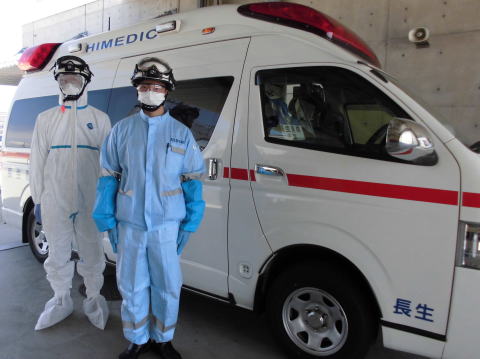 | 長生郡市消防本部では、新型コロナウイルス感染症の拡大防止のため、救急車内の消毒実施や、救急要請時に「標準感染予防策」(写真参照)と言われる、感染防止衣・マスク・手袋等の着用をし、感染予防(うつさない・うつらない)の徹底を図り救急活動を行っています。 テレビなどで見るような水色の感染防止衣や、白い防護服を着ているからといって、新型コロナウイルス感染症に感染している方に対応しているというわけではありません。 新型コロナウイルス感染症に限らず、日常的に何らかの感染症への感染が疑われる方の対応をした場合は、速やかに隊員自身や救急車内の消毒を行いますので、ご安心ください。また、そのような装備をして活動しているところを見かけても、カメラやスマートフォン等で写真・動画を撮影することや、傷病者・ご家族の誹謗中傷をしたり、近隣住民の方の不安を煽ったり、正確でない情報の発信などをする事は、ご遠慮ください。 皆さまの御理解と御協力をお願いいたします。 |