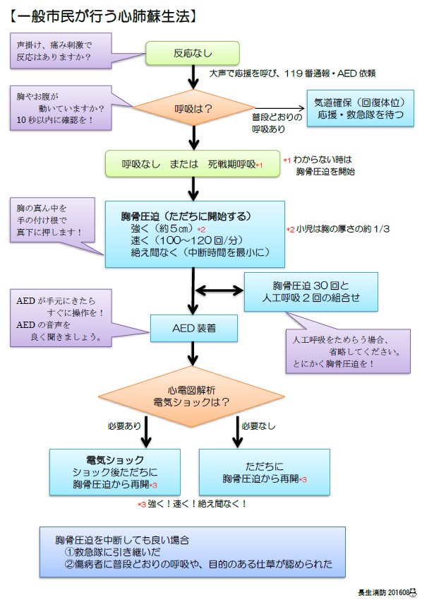 ここに心肺蘇生法のフローチャートを載せますが、定期的に救命講習を受講することをお勧めします。