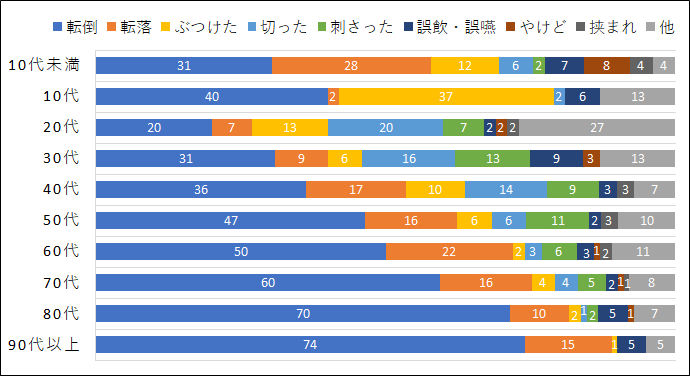 | 当消防本部の救急車で搬送された方の原因(平成28年)は、急病による搬送が約60%、一般負傷(交通事故や労働災害などに分類されない負傷で、転倒・転落・やけど・喉詰めなどがある)による搬送が約20%と、急病と一般負傷が多くを占めています。 急病の内訳では脳や心臓の病気が多く、これらの病気は大人の突然死の原因としても以前から常に上位にあがっています。脳や心臓の病気に限らず、大きな病気の根底には「生活習慣病」と呼ばれる病気があることが少なくありません。 また、一般負傷の内訳では、転倒による負傷が約54%で半分以上を占めています。転倒は、40代未満の各年代でも30~40%を占め、20代を除くすべての年代で第1位となっています(20代では第2位)。特に、60代を超えると50%以上の方が転倒による負傷で救急搬送をされています。 更に、転倒と転落を合わせると、50代以上の年代で70%を超えており、日常の中での負傷による救急搬送がいかに多いかが分かります。 |