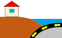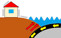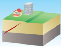 | 地震とは、地下の岩盤が周囲から押されたり引っ張られたりすることによって、ある岩盤が急激にずれることです。この岩盤の急激なずれが地面に達すると、地面が揺れます。 日本でおきる地震には、海底にある岩盤が地球の運動でひずむことでおこる「プレート境界型」と、内陸にある地面の裂け目が動いておこる「活断層型」という2つのタイプがあります。 |