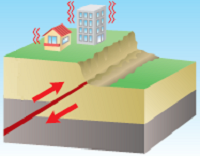 | 海洋プレートの動きなどにより、岩盤に力が加わり「ひずみ」がたまる。 | 断層面を境に両面の岩盤がずれ動き、地震が発生。 | ||||||