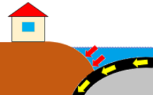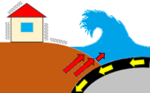 | 海洋プレートが大陸プレートの下に沈み込み、大陸プレートがひきずりこまれて「ひずみ」がたまる。 | ひずみが限界に達すると、大陸プレートが跳ね上がって地震が発生。海底が動くことにより津波が発生する。 | ||||||