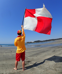 | ● | 「津波フラッグ(赤と白の格子模様の旗)」を知っていますか? 令和2年6月24日から海水浴場等で、「津波フラッグ」により大津波警報、津波警報、津波注意報(以下、「津波警報等」という)が発表されたことをお知らせする取組が始まりました。 津波警報等は、テレビやラジオ、携帯電話、サイレン、鐘等、様々な手段で伝達されますが、令和2年夏から海水浴場等で「津波フラッグ」による視覚的伝達が行われます。「津波フラッグ」を用いることで、聴覚に障害をお持ちの方や、波音や風で音が聞き取りにくい遊泳中の方などにも津波警報等の発表をお知らせできるようになります。海水浴場や海岸付近で津波フラッグを見かけたら、速やかに避難を開始してください。 新たに導入された「津波フラッグ」は赤と白の格子模様の旗で、国際的に海で危険からの緊急避難を知らせる際に用いられる「U旗」と同じデザインです。 赤と白の格子模様以外の旗を見かけた場合でも同じように速やかに避難を開始してください。 |